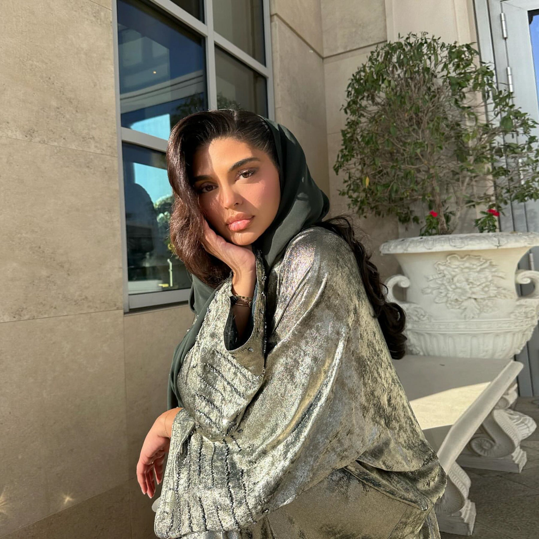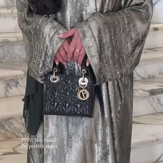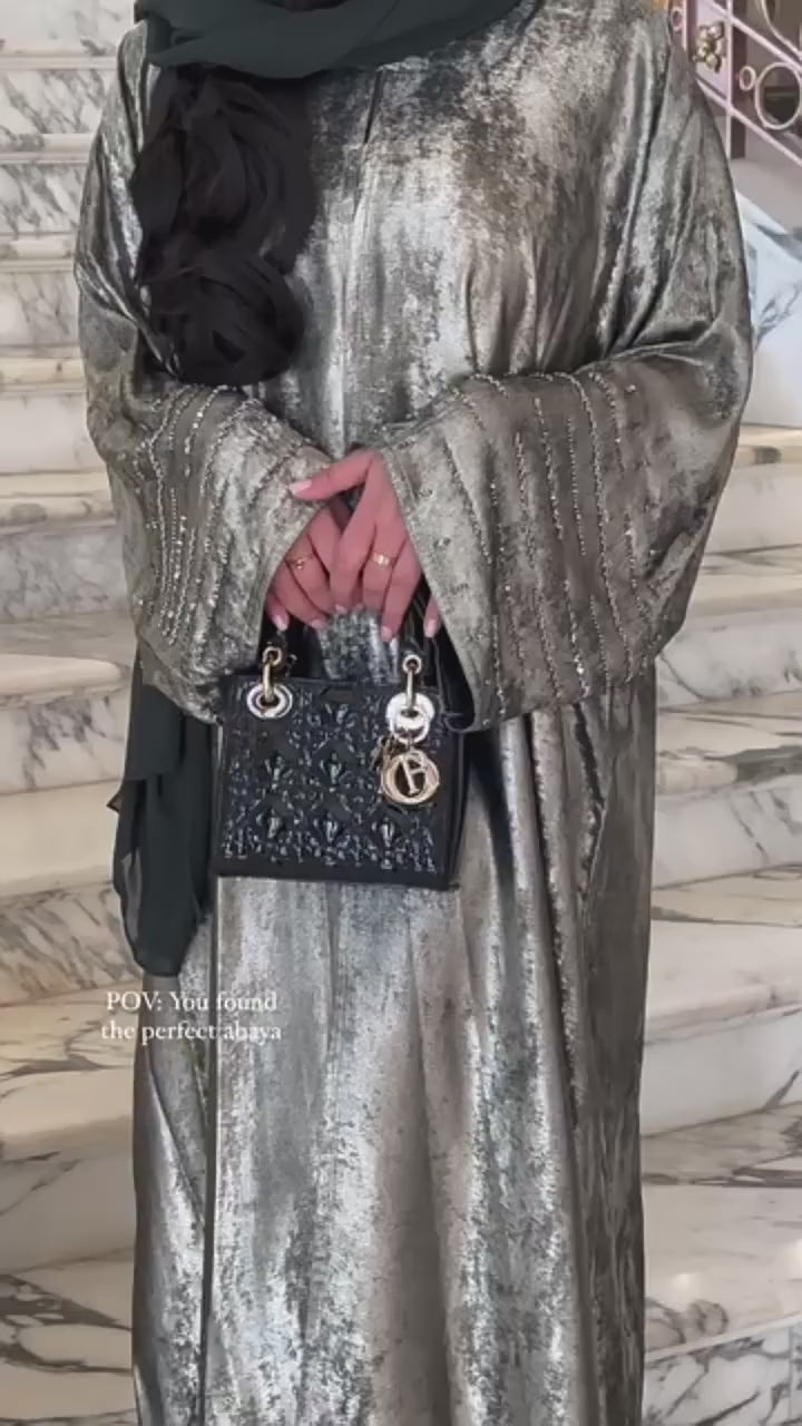 Shine with understated glamour in this iridescent open abaya, designed to catch the light with every movement. The sleeves are adorned with sparkling diamante embellishments, adding a touch of luxury to a flowing, lightweight silhouette. Perfect for special occasions or evening wear, this abaya combines modest elegance with modern sparkle for a standout look.