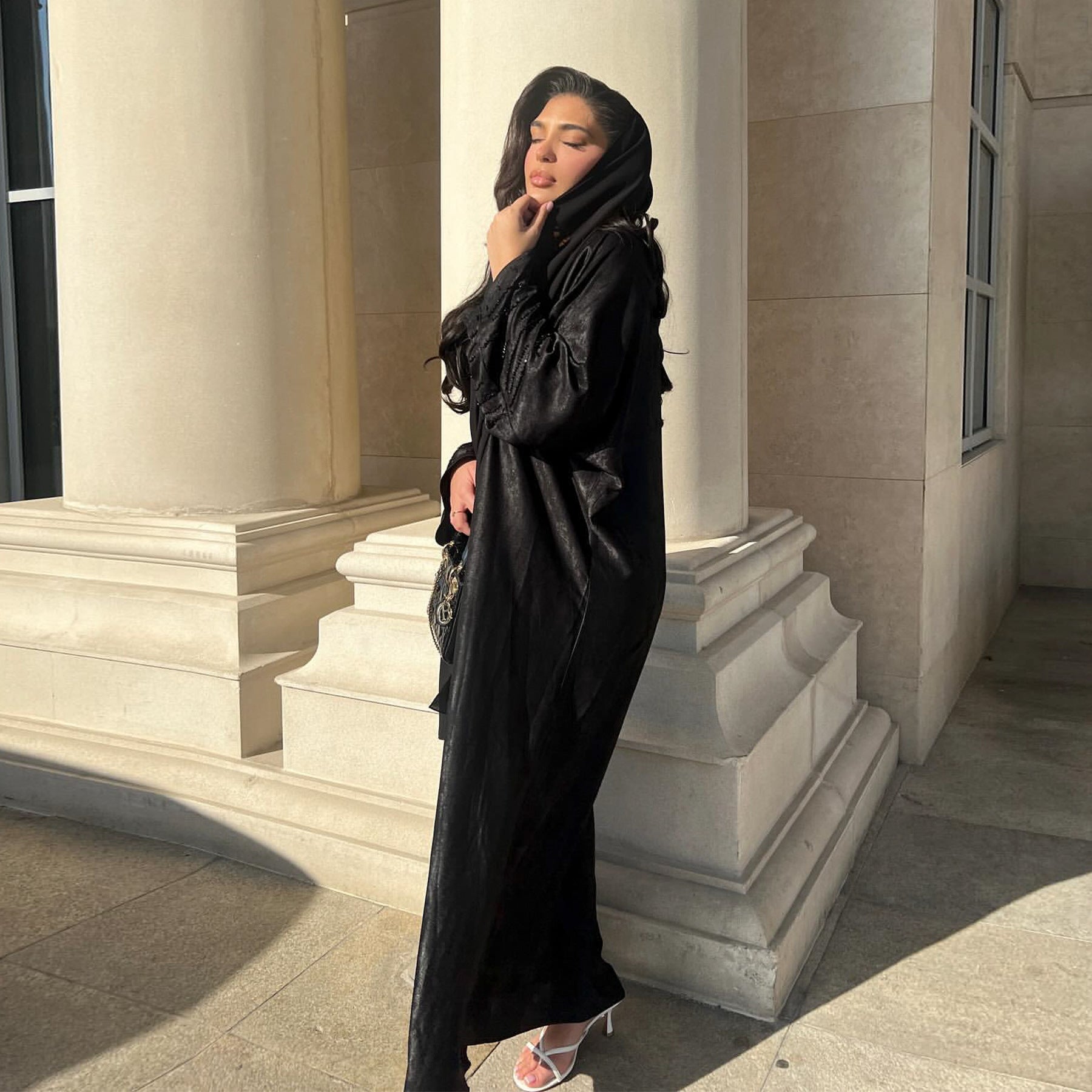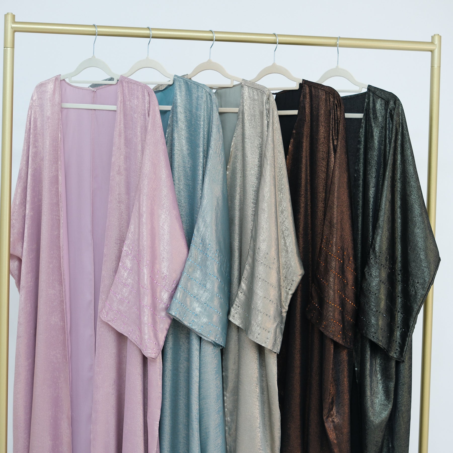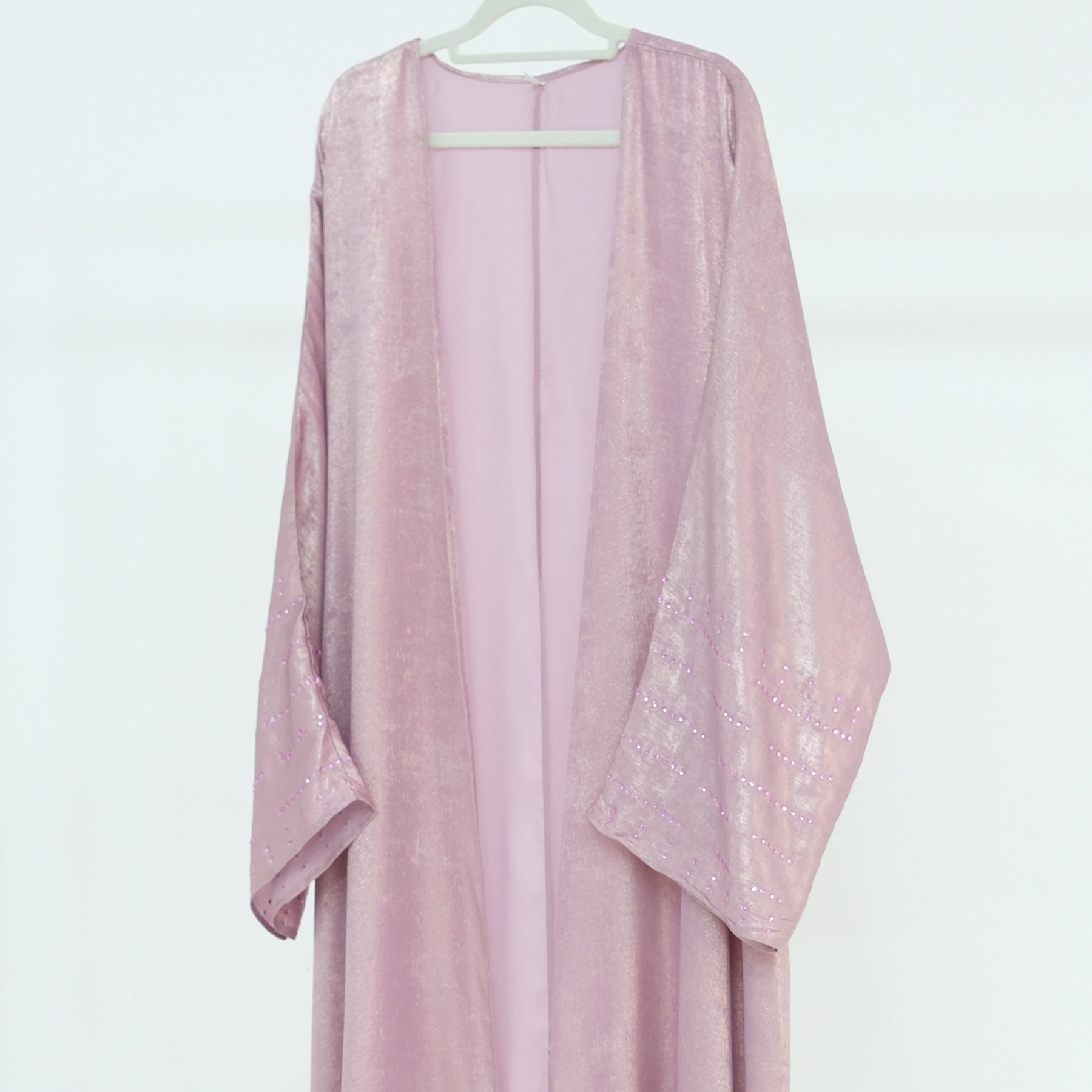 Lustrous Iridescent Open Abaya with Diamante-Embellished Sleeves