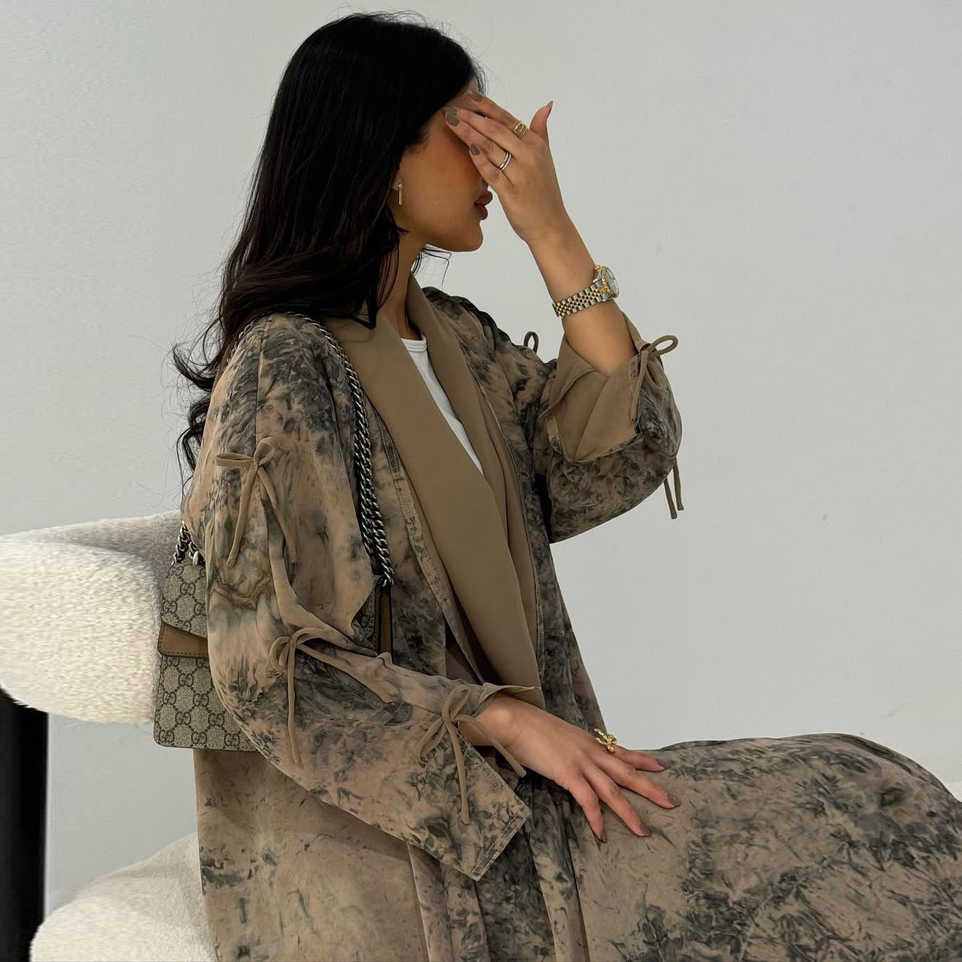 Marble Luxe Abaya with Headscarf & Ribbon Sleeves